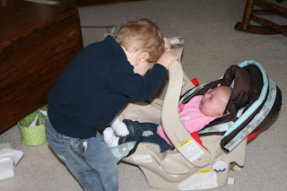 And last, but certainly not least is Callie! Oh .. sweet Callie! I have had her three times over the past week, today being my last day and I am really gonna miss her. She is such an easy relaxed baby. She is happy as can be! Grant really likes her too.. he kept trying to share his glasses and cowboy boots with her! She was in her carseat and he kept trying to rock her when she was fussing!