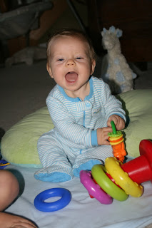 I can't believe this sweet little face will be six months old in just two days. It seems like time is slipping away from me. I am trying to relish these baby stages as much as possible! Here are some highlites:Sitting up full time without support (although I keep the boppy behind him just in case!).